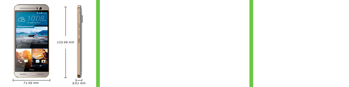 HTC One M9+ kasutab 5.2” ultra HD 2K ekraani ja sisemiste komponentide mahutamiseks hingematvat disaini, säilitades siiski kompaktse suuruse, mis mahub kergesti kätte. Kaamera safiirist lääts pakub kriimustuskindlust kauakestvaks kasutuseks.